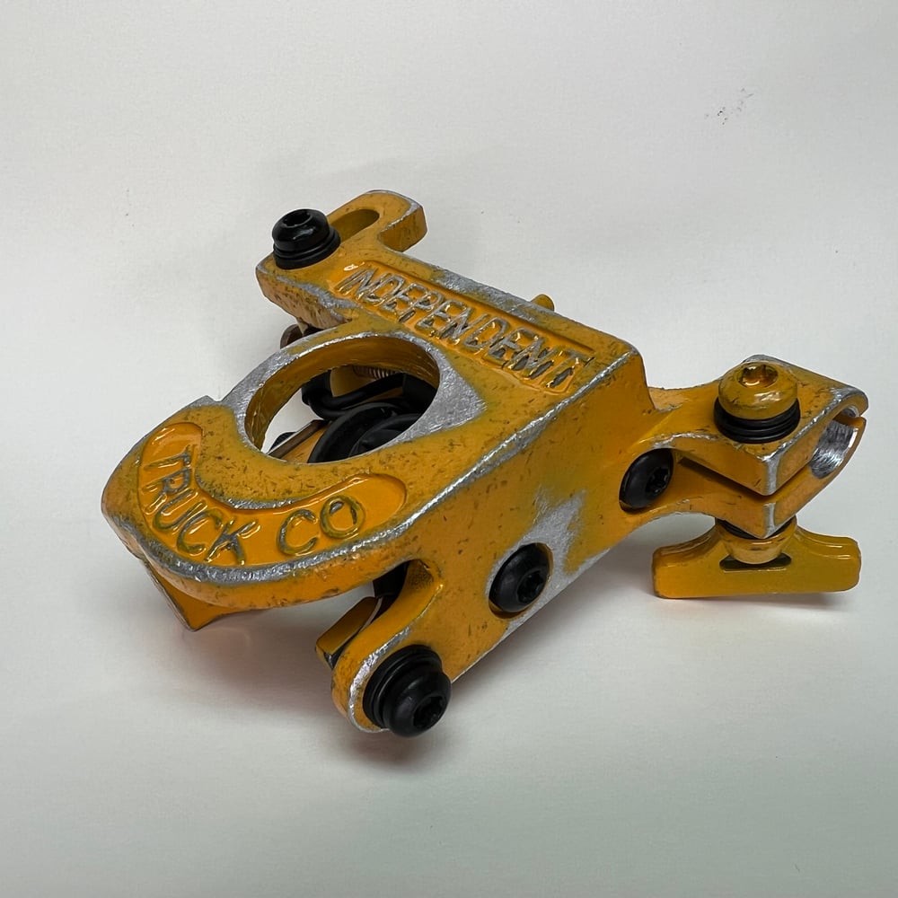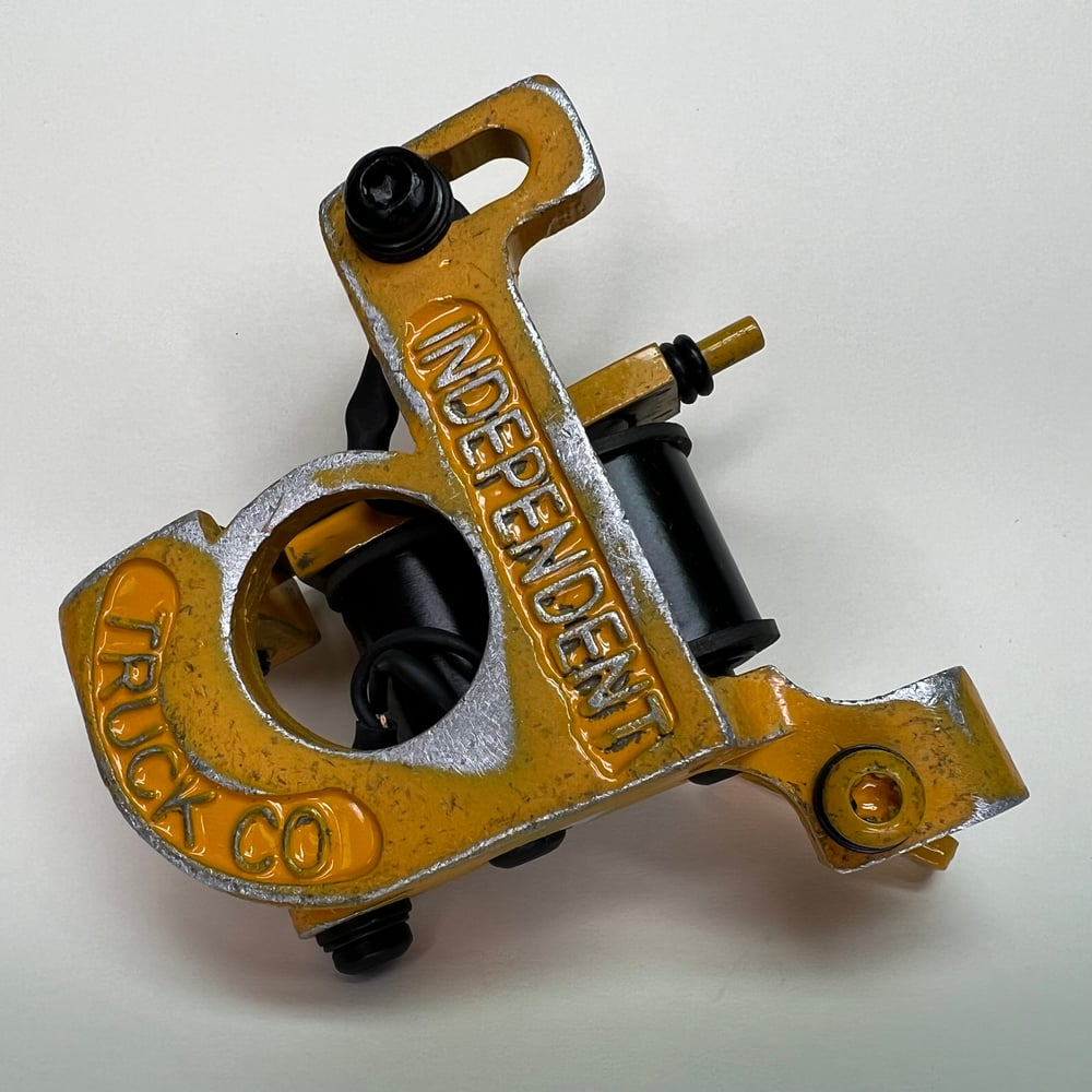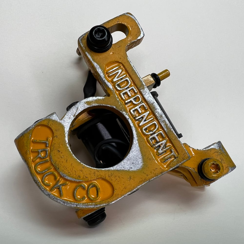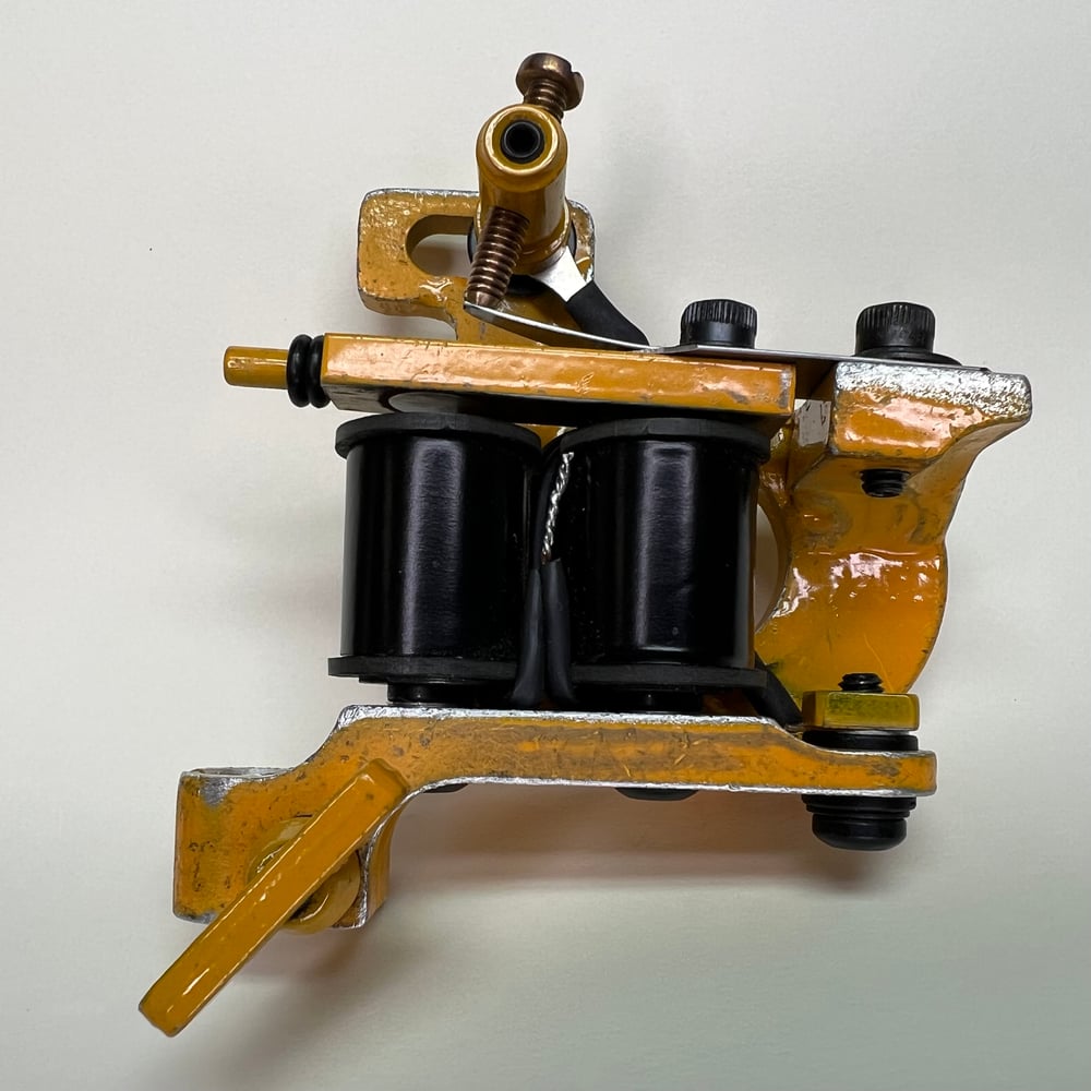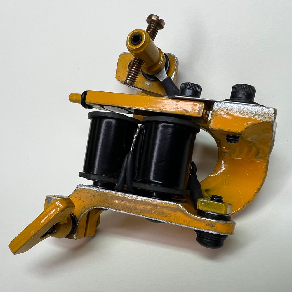 Yellow distressed powder coated, bent up independent trucks, Widow liner. Runs 125 CPS at 5.5 V with 1” coils great machine for daily driver groupings 3-11 this machine has a medium length throw and a nice smooth hit. Well broken in with a visible witness mark on the A-bar and ready to work.