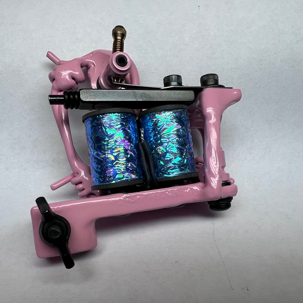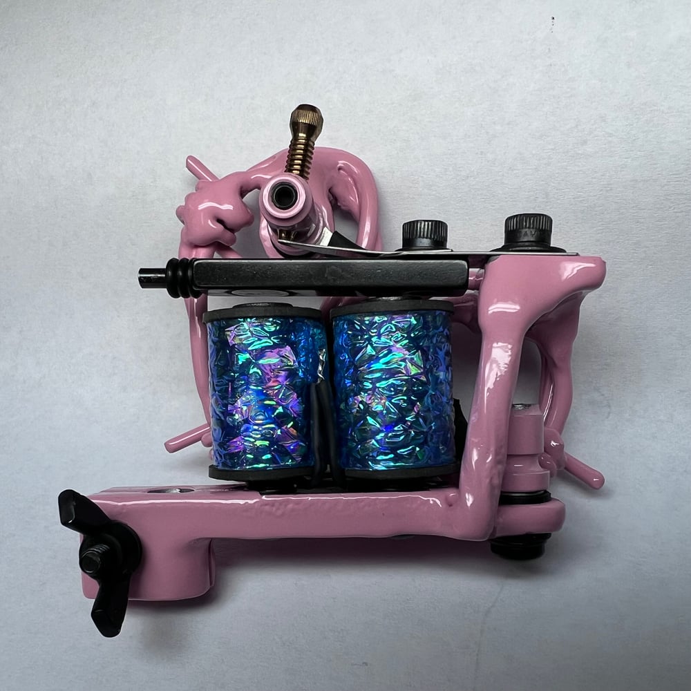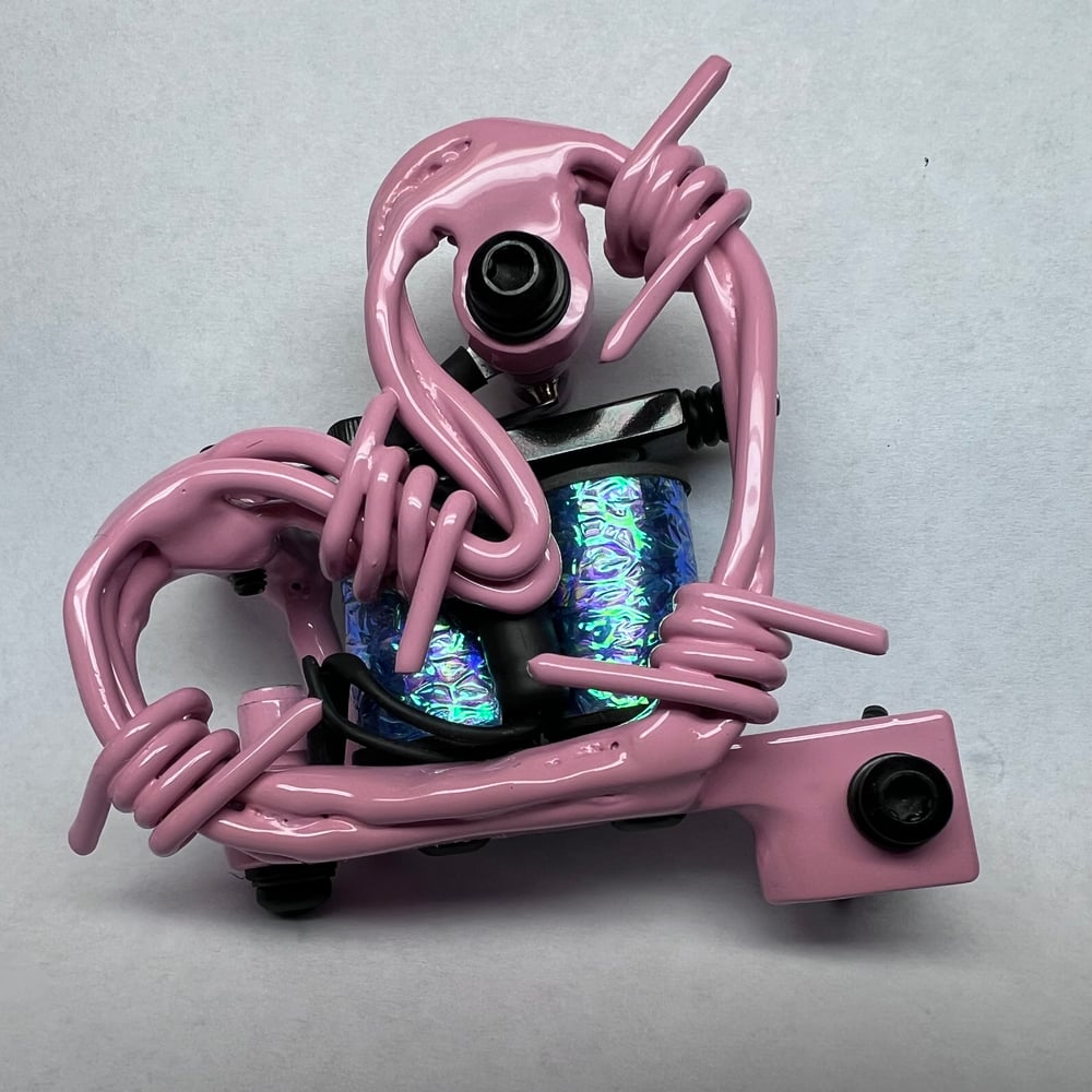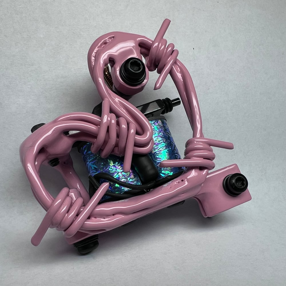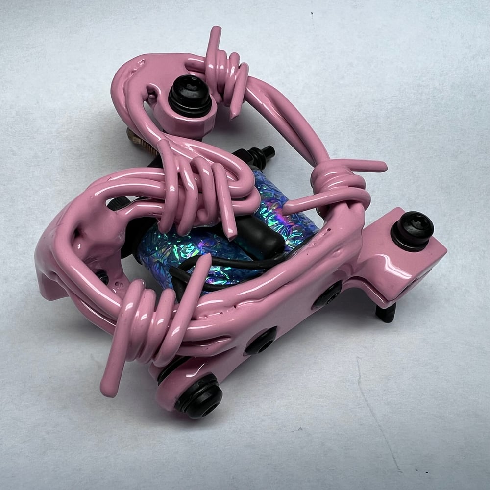 Handmade aluminum barbwire tattoo machine. Started out as aluminum welding rod. I twisted the stock down and formed it barbwire and welded them individually before laying them out into a side plate and welding them again. This machine has 1.125 coils that pack a punch. Runs 130 hz at 5.5V great for daily driver groupings 3L-11L I don’t mind the majority of a Sleeve with it this week and I used a loose nine with ease.